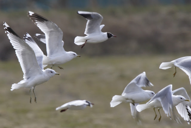 Larus canus), 3cy, 10.4.2007, Ny Frederikskog, Højer, 3 photos, på det øverste af de tre billeder ses fuglen længst til venstre i billedet med en adult Stormmåge foran og en adult
